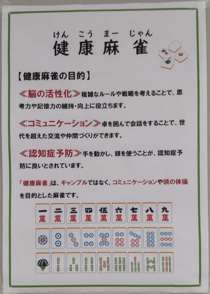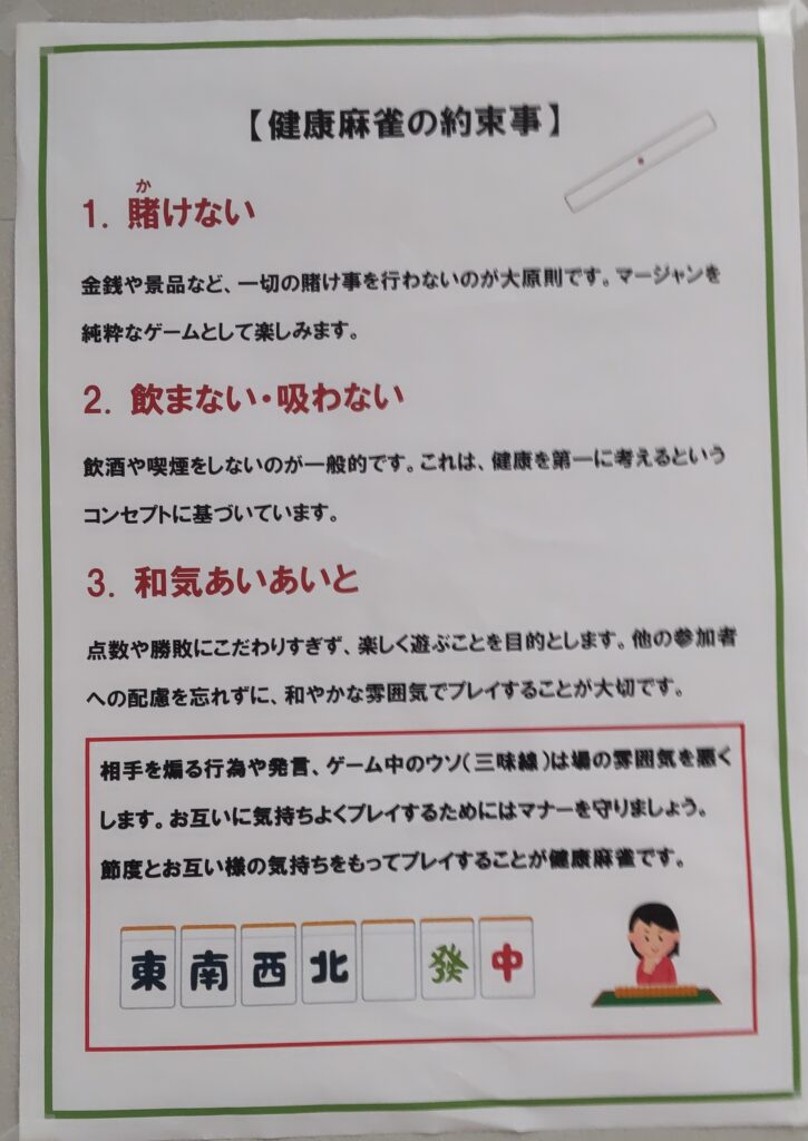 健康マージャンとは約束事を合言葉に「健康づくり・仲間づくり・生きがいづくり」を目的としたマージャンです。