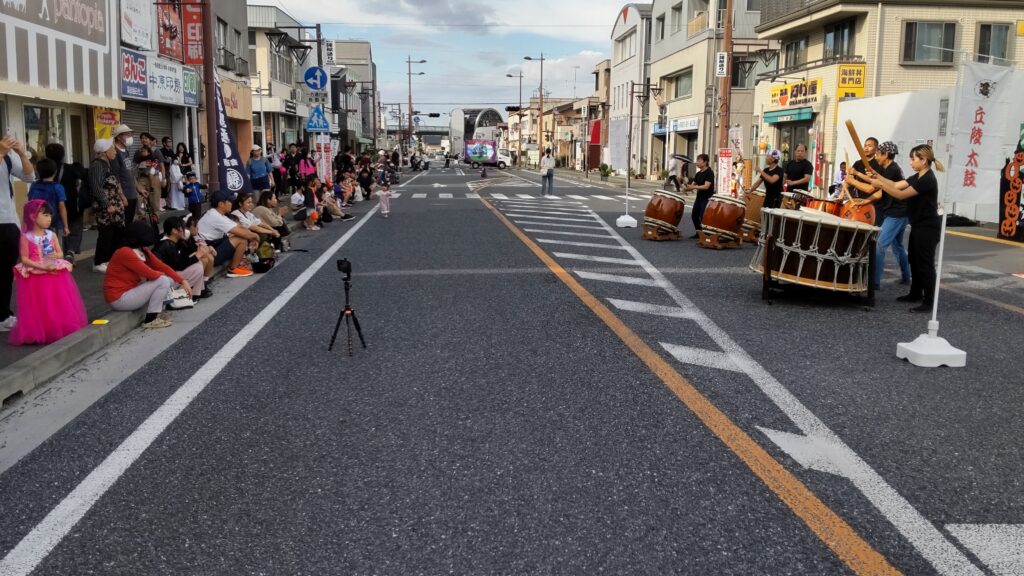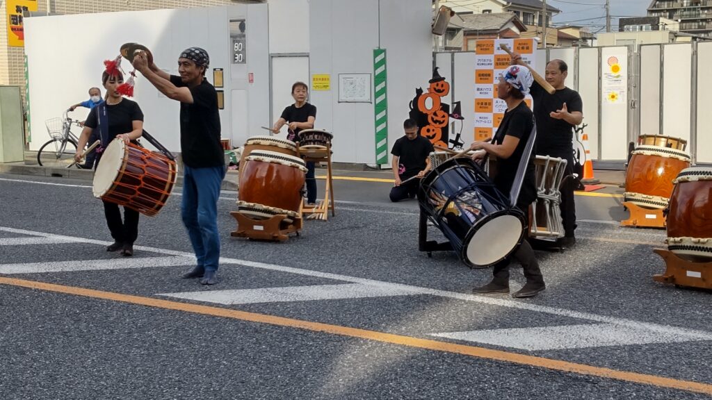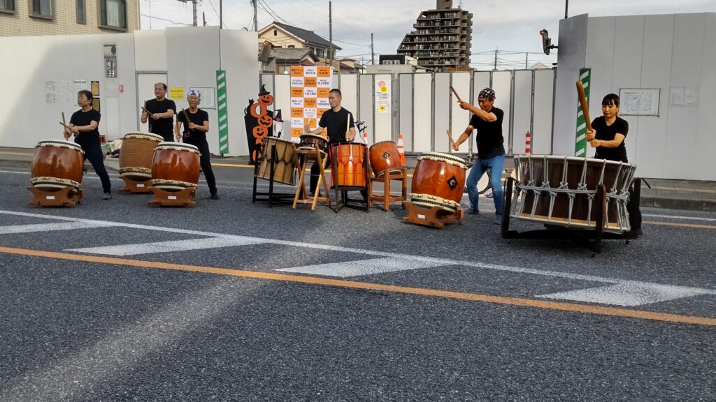 令和7年10月13日(月)東松山市の「第2回 親子で歩こう!ハロウィンウォーク」のイベントとして午後2時30分に陣屋通り、午後4時にぼたん通りで丘陵太鼓の和太鼓演奏を披露しました。5曲(族、彩、ようさり、ぶちあわせ、大太鼓)の演目で2公演行いました。