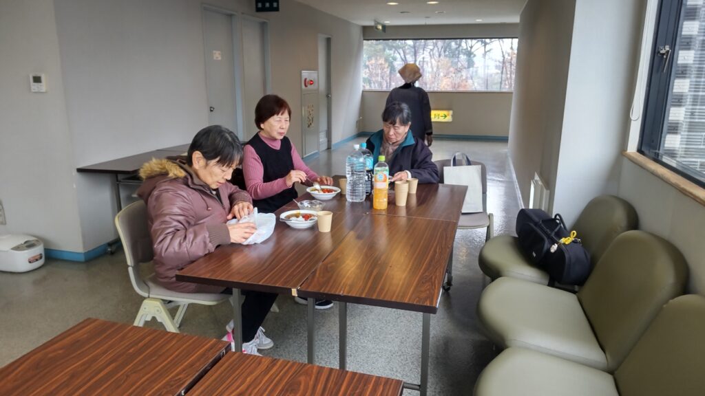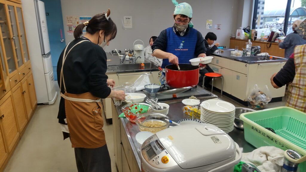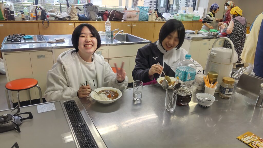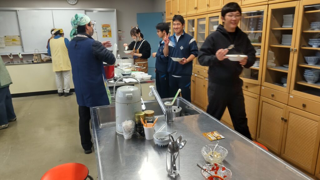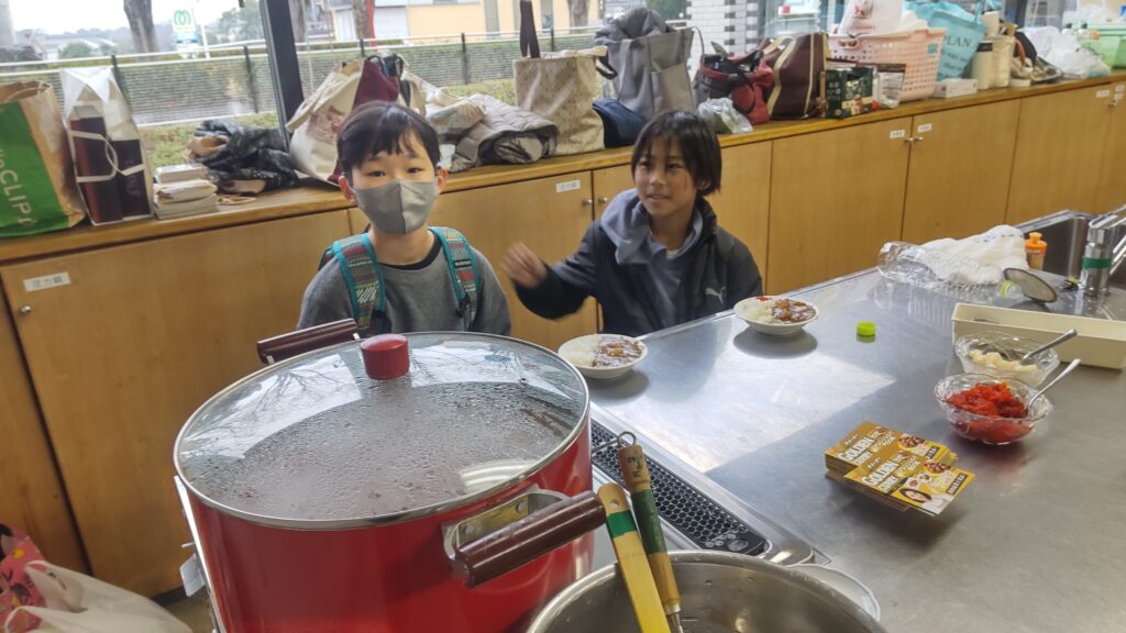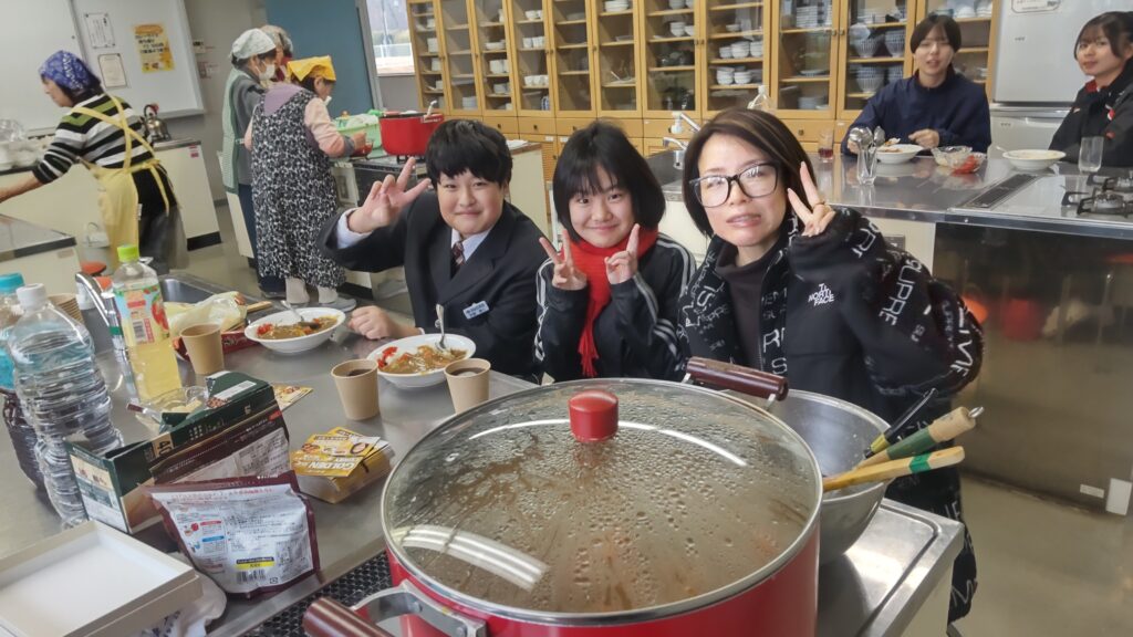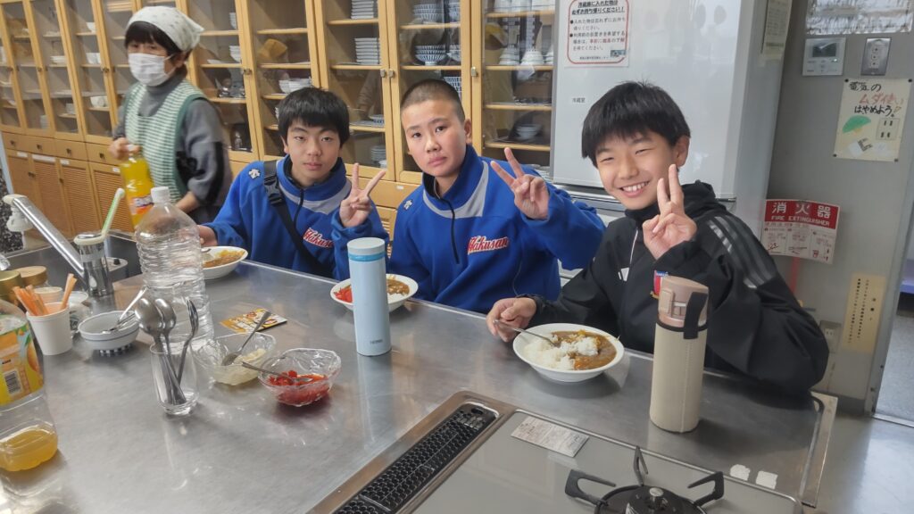 12月24日(水)、雨天のクリスマスイブとなり、今日はこの冬で最も寒い一日となりました。終業式を終えた桜山小学校および白山中学校の児童・生徒が大勢訪れました。「夕やけひろば」の開催にあたり、エスビー食品株式会社からカレールー200食分の協賛を頂き、社会福祉協議会およびボランティアスタッフ8名の協力により、特選「ゴールデンカレー」がふるまわれました。持ち帰りを希望する方や、その場でカレーを食べた方の中には、追加でおかわりをする人が多く見られました。