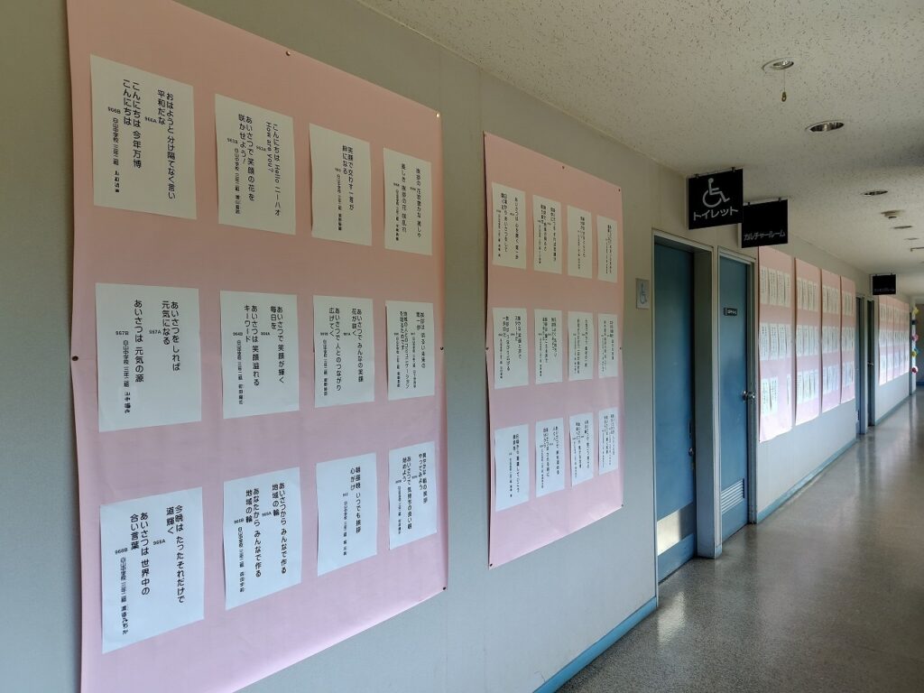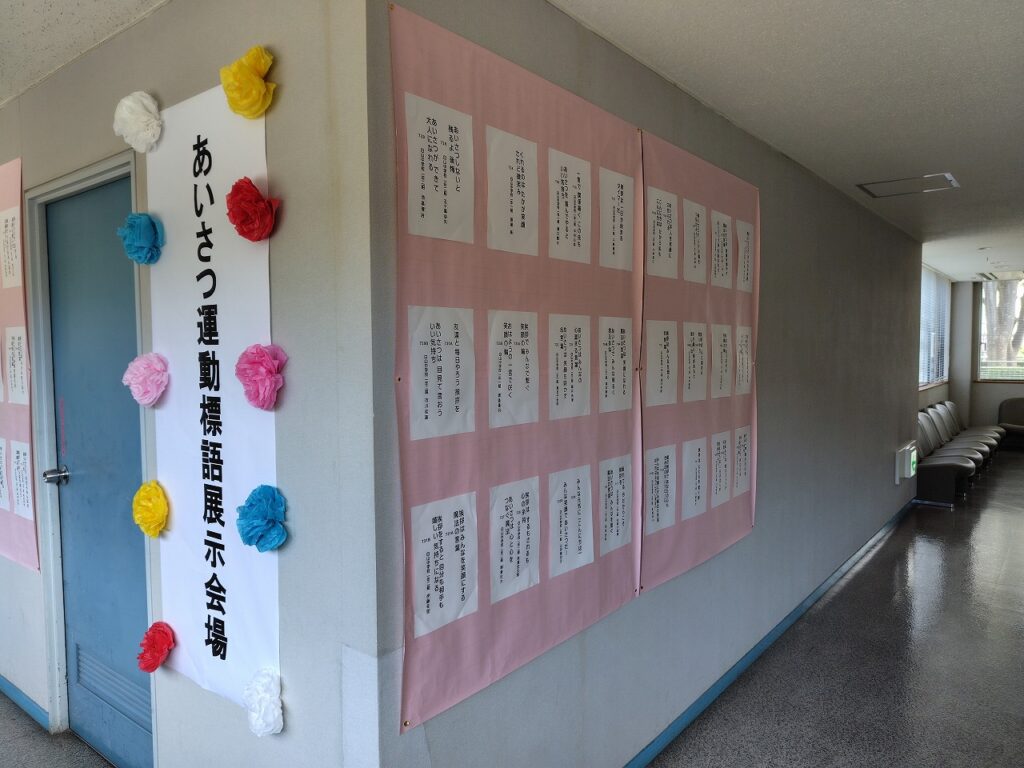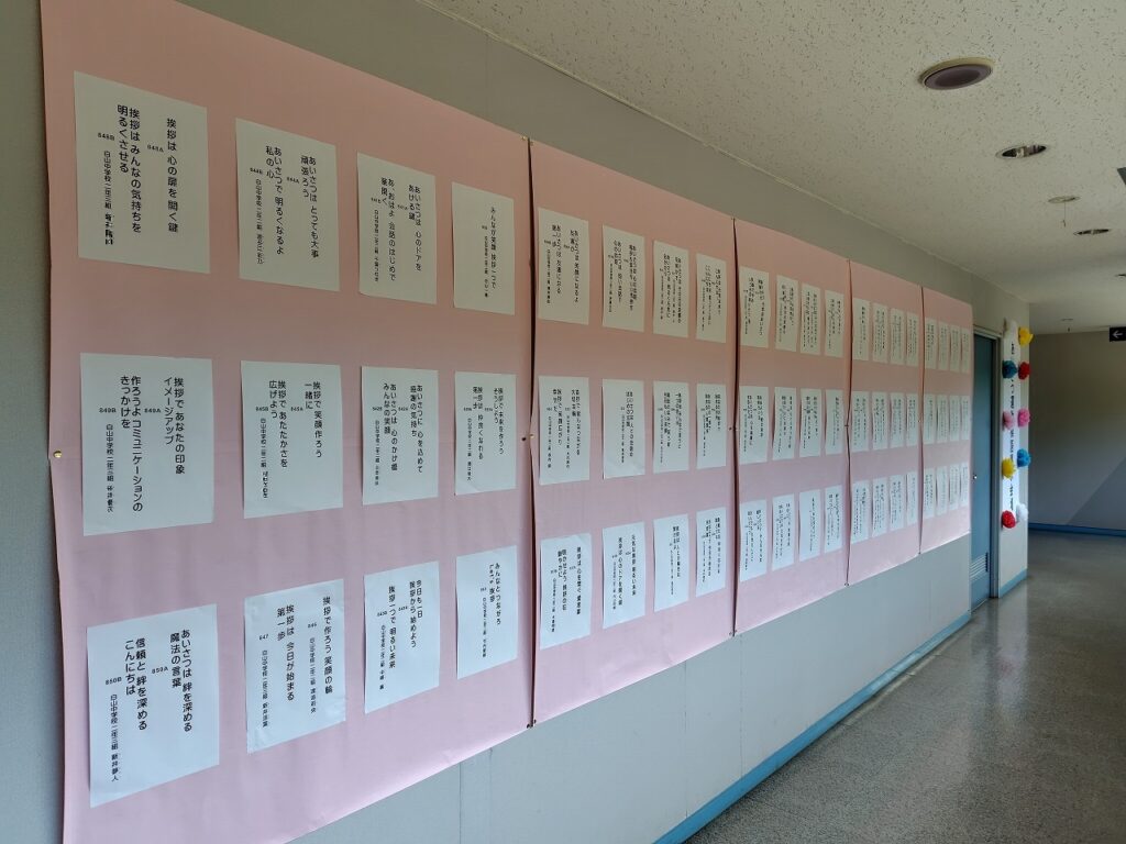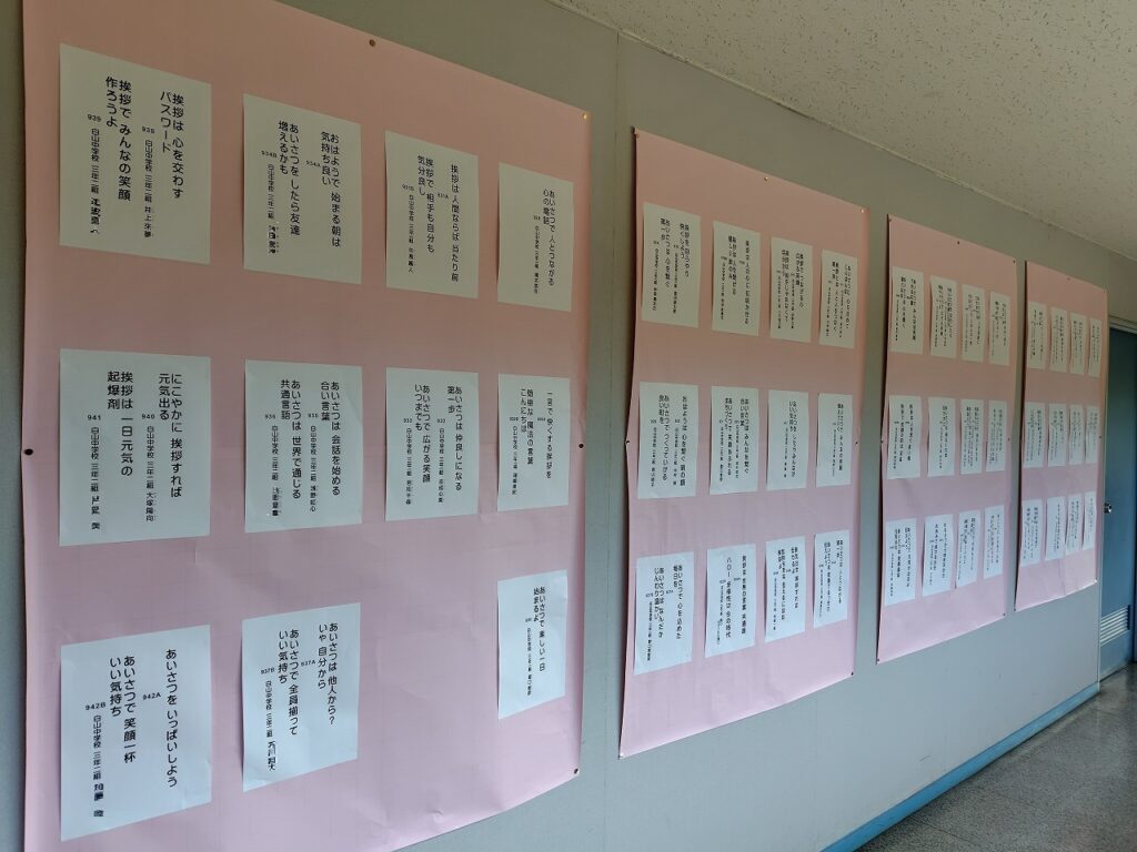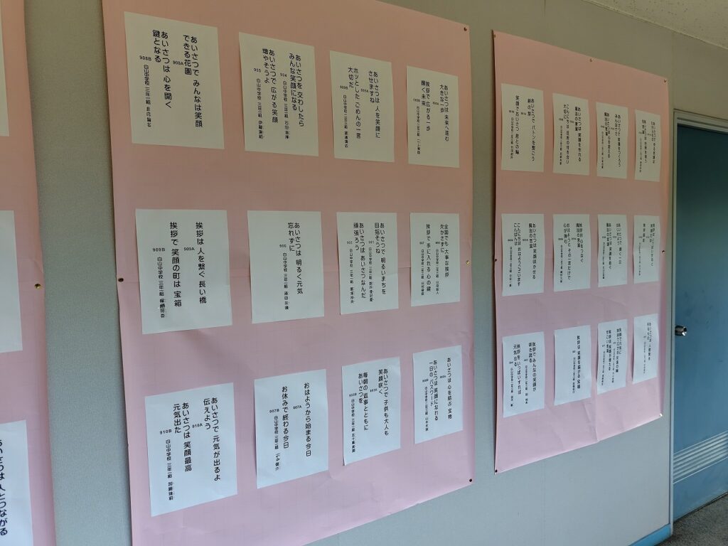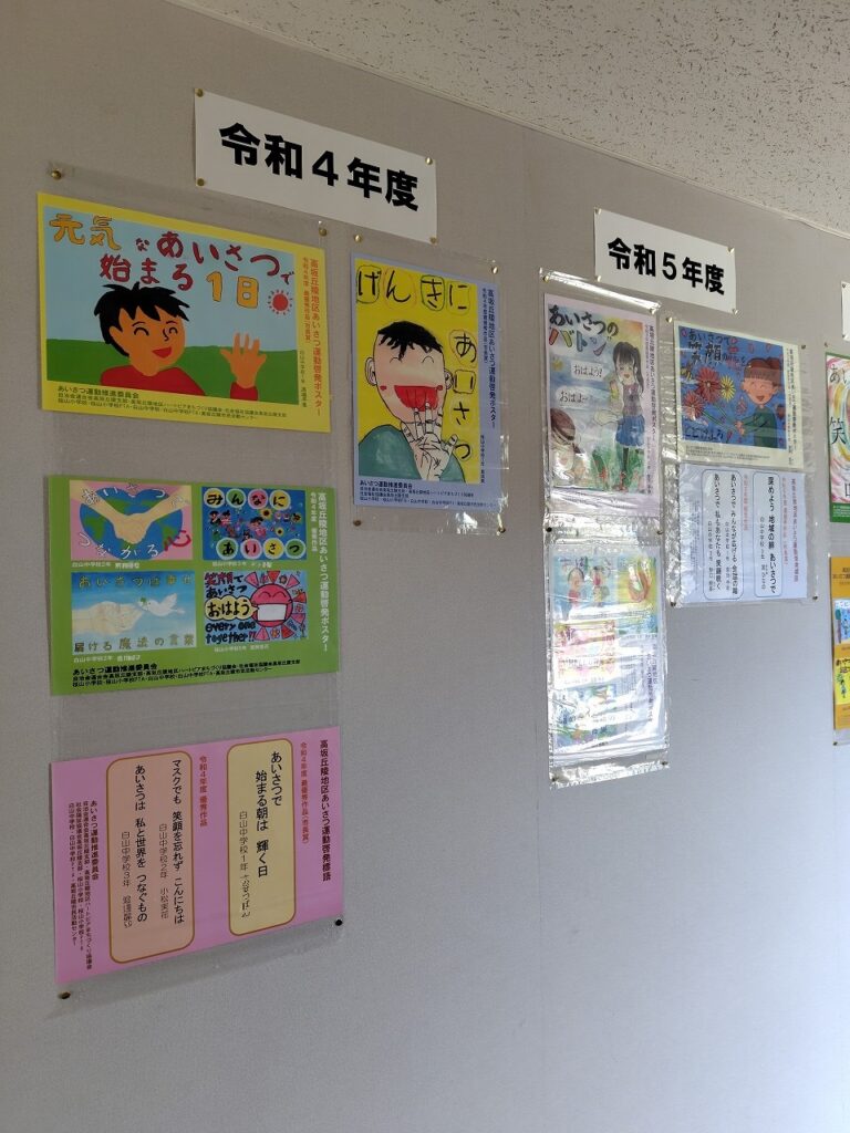 高坂丘陵地区の「あいさつ運動推進委員会」が桜山小学校と白山中学校に呼びかけて夏休みに募集した「あいさつ運動」の作品(標語・ポスター)を高坂丘陵市民活動センター(1・2階廊下)で展示しています。展示期間は10月8日(水)~28日(火)です。