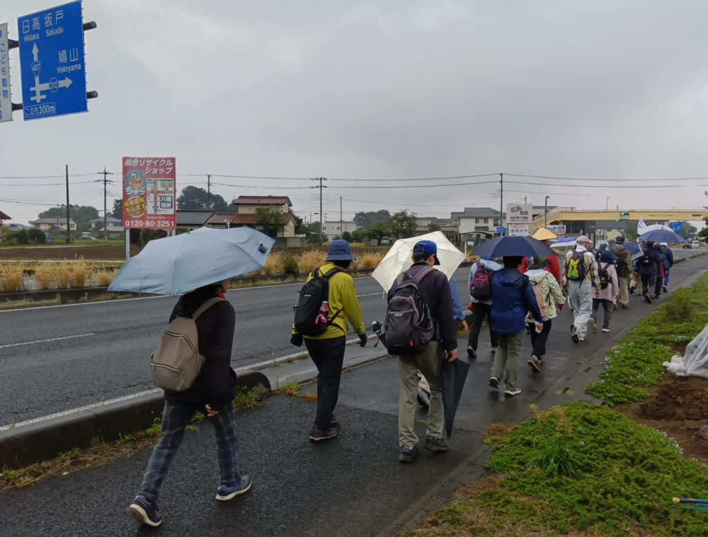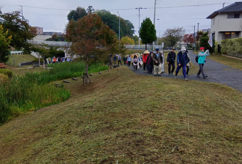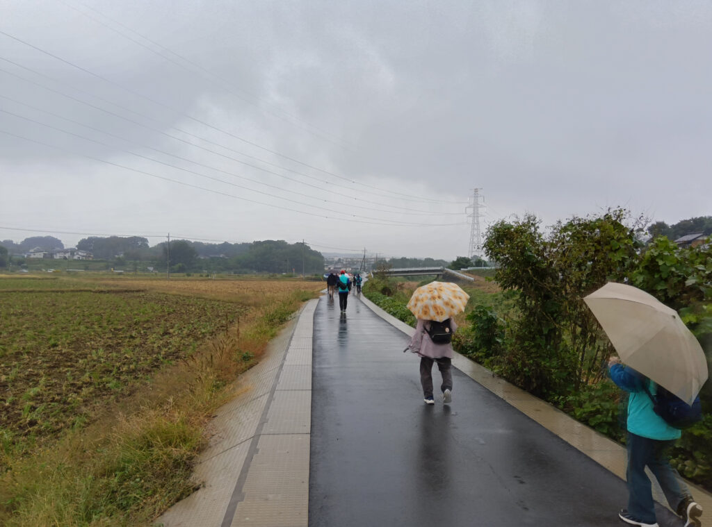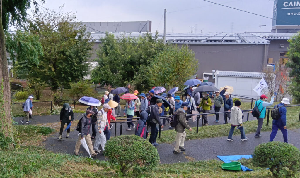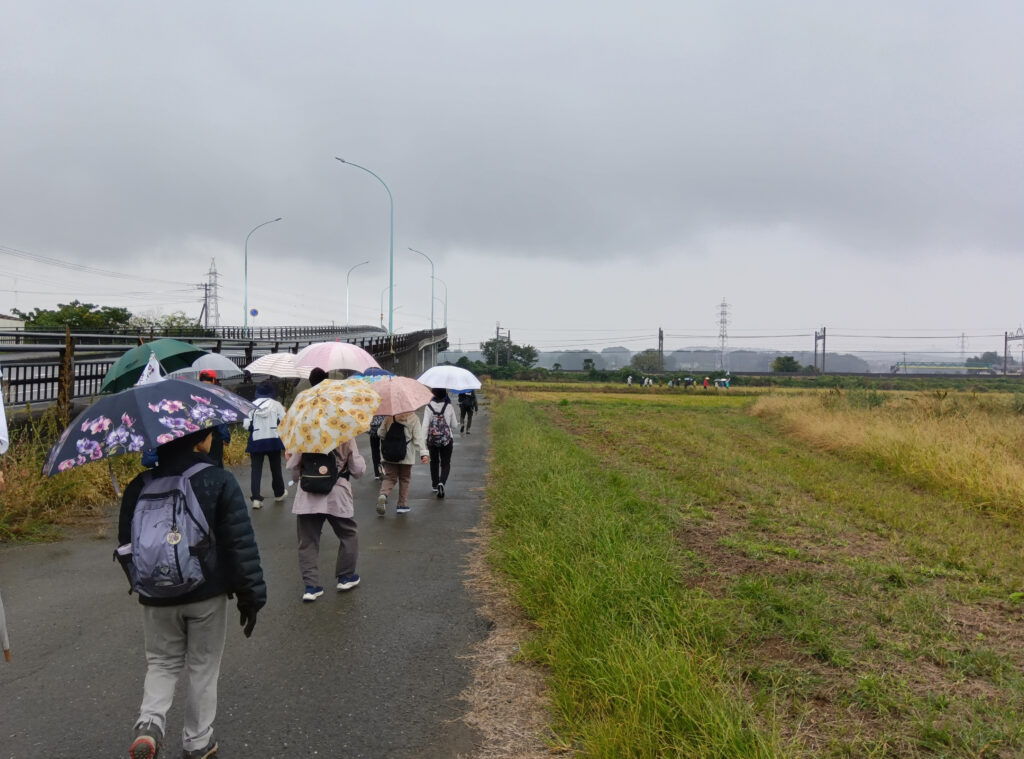 月例ウォーキング「せせらぎ緑道コース」 2025年10月25日 最終更新日時 : 2025年10月29日 THR 10月25日、朝からあいにくの霧雨、87名の多くのウォーカーが集まり、せせらぎ緑道と高坂地区文化祭をめでた。 午前8時30分集合 約6キロの行程 受付 出発!虹の橋を渡る 白山坂 地蔵橋 高坂駅西口でしばしの休憩 せせらぎ緑道 小雨になってきたせせらぎ緑道 国道407号線(歩道は川島こども動物公園自転車道を兼ねる)を南下 南地区体育館は文化祭の壮大な会場 稲刈り後の農道を九十九川方向に