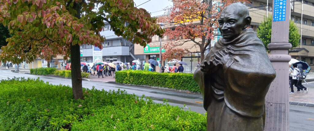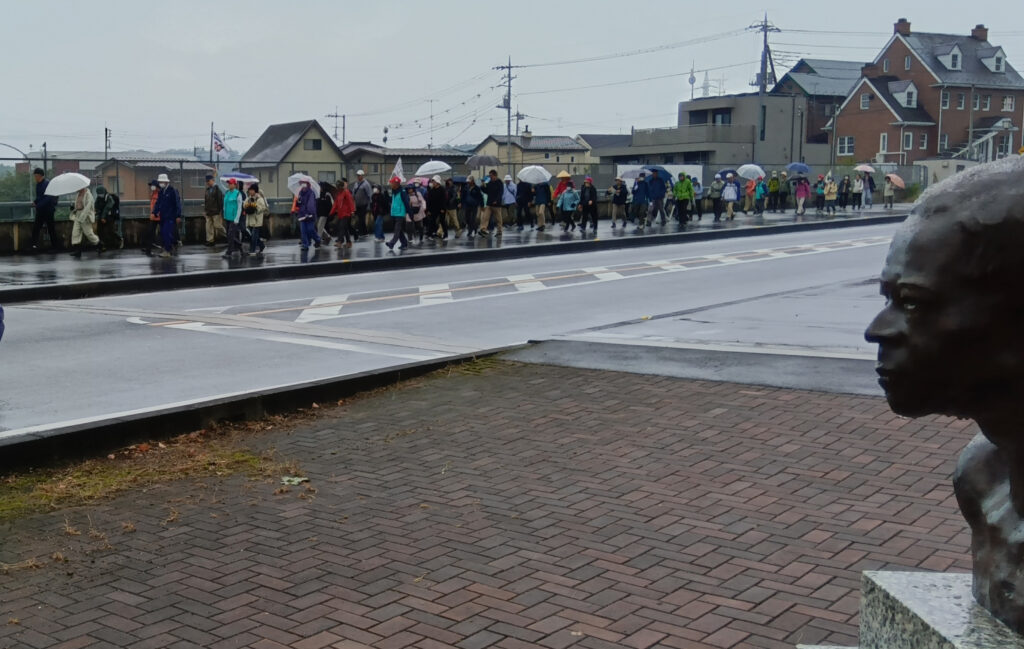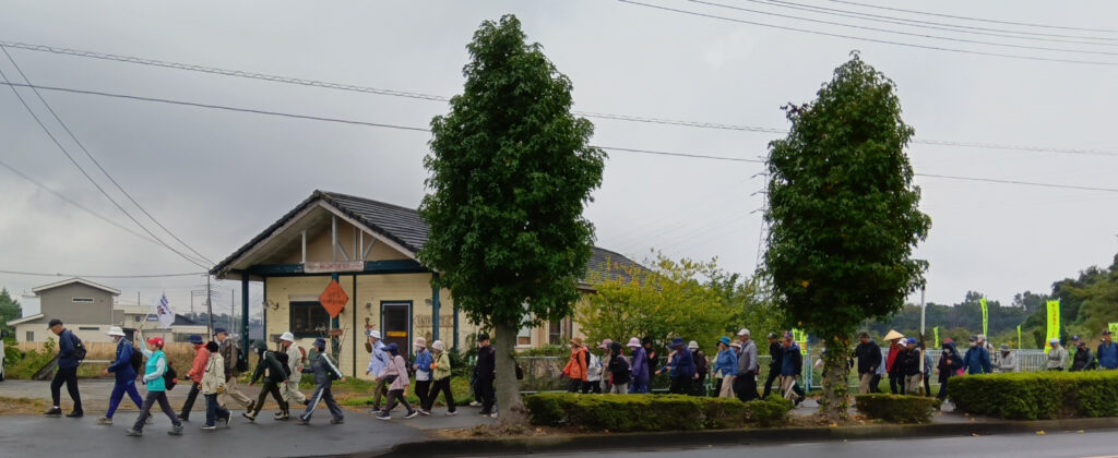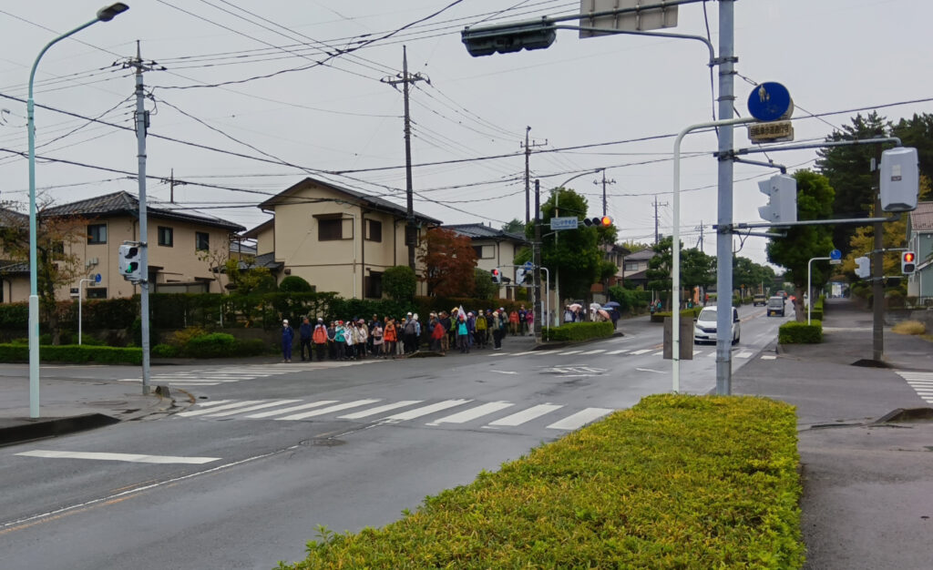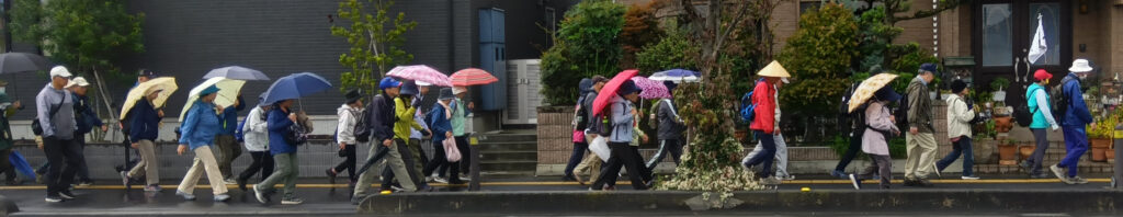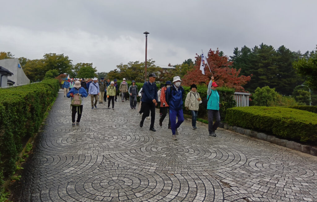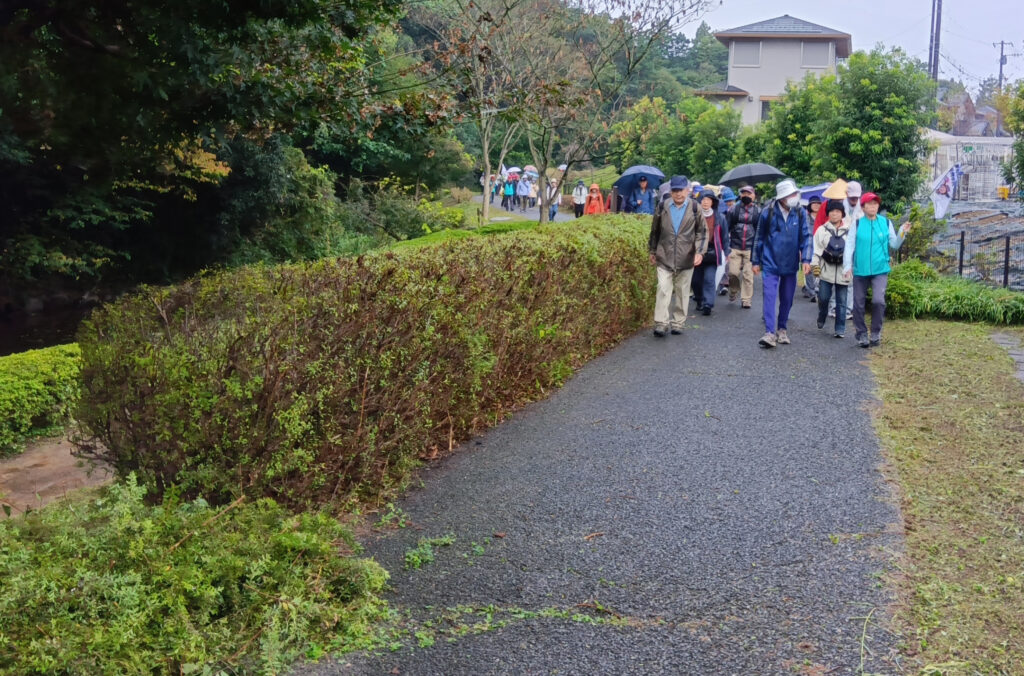 月例ウォーキング「せせらぎ緑道コース」 2025年10月25日 最終更新日時 : 2025年10月29日 THR 10月25日、朝からあいにくの霧雨、87名の多くのウォーカーが集まり、せせらぎ緑道と高坂地区文化祭をめでた。 午前8時30分集合 約6キロの行程 受付 出発!虹の橋を渡る 白山坂 地蔵橋 高坂駅西口でしばしの休憩 せせらぎ緑道 小雨になってきたせせらぎ緑道 国道407号線(歩道は川島こども動物公園自転車道を兼ねる)を南下 南地区体育館は文化祭の壮大な会場 稲刈り後の農道を九十九川方向に