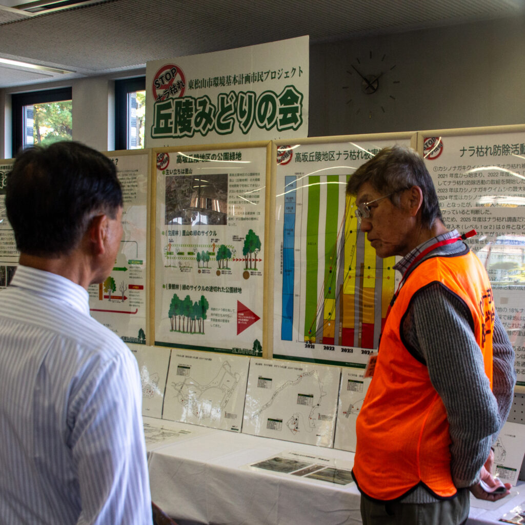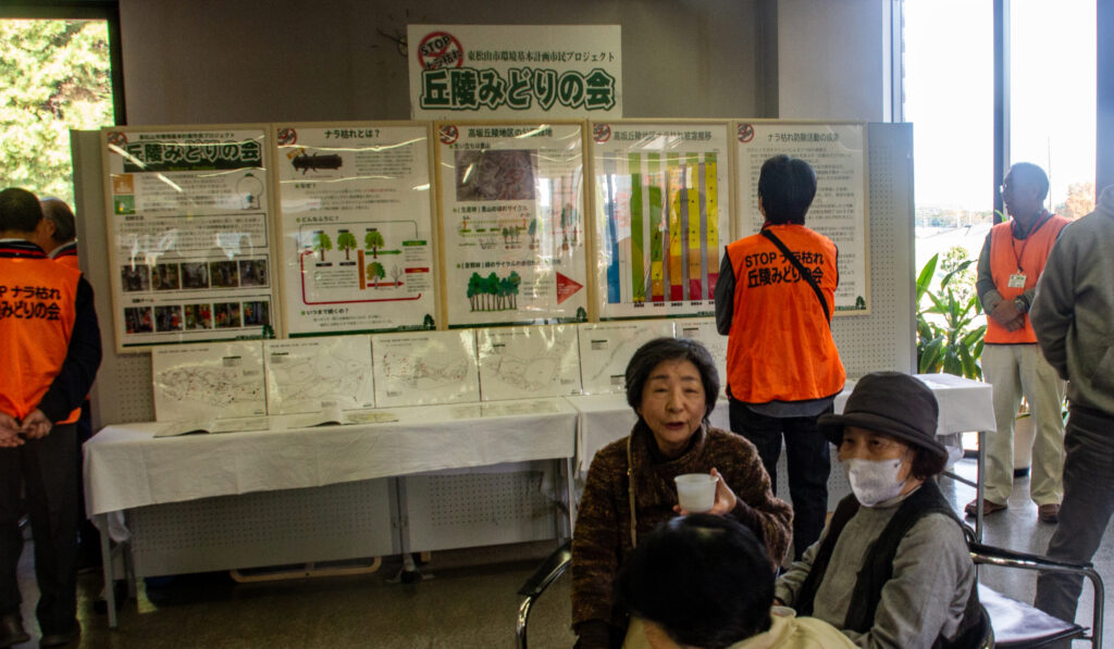 高坂丘陵地区の公園緑地では、令和3年よりカシノナガキクイムシによるナラ枯れが出現し、コナラやクヌギの立ち枯れが発生しています。当会は丘陵地区のみどりを守るため令和4年に設立され、行政と協力しナラ枯れ防除に取組んできました。