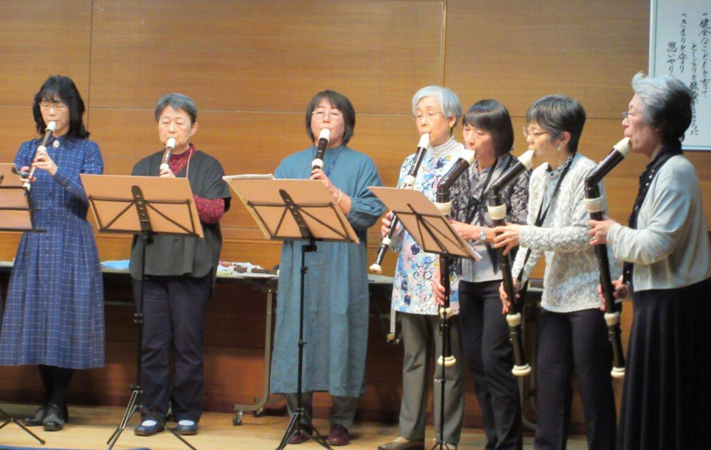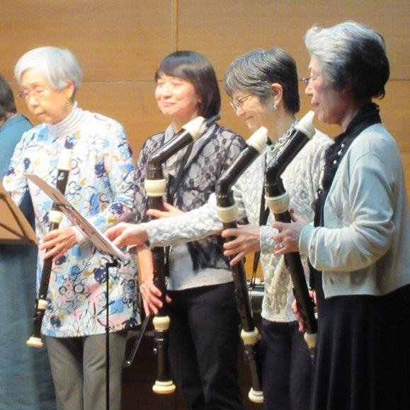 リコーダーは小・中学校の音楽教材として馴染みの深いものですが、私たちは他にも音域の違う大小のリコーダーを使って演奏します。1989年の結成以来「楽しく、無理せず、熱心に」の精神で、和気あいあいと練習しています。