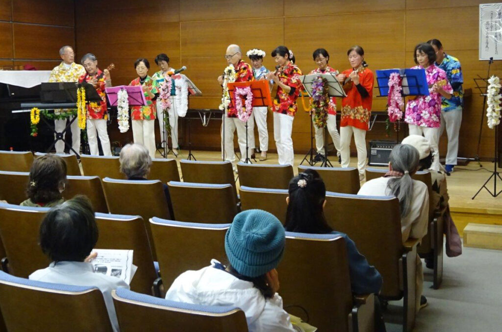ウクレレの楽器演奏を通じて、新旧の仲間たちと演奏と歌にて継続して楽しむクラブです。ボランティア等にて各施設へ訪問して演奏できるようにレベルアップを都度図っています。演奏曲はハワイアンソングほか何にでも挑戦しています。クラブ会員は現在20名(男性6名、女性14名)