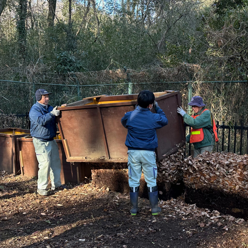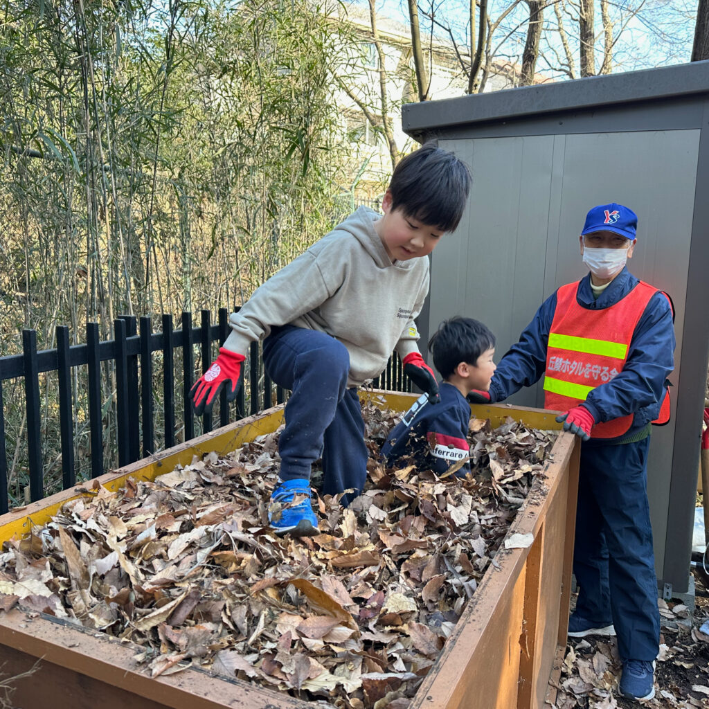 周辺の落葉を空になった落葉箱に投入。押し固めるのに楽しいふわふわのお手伝いも。