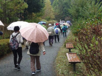 10月25日、朝からあいにくの霧雨、87名の多くのウォーカーが集まり、せせらぎ緑道と高坂地区文化祭をめでた。 午前8時30分集合 約6キロの行程